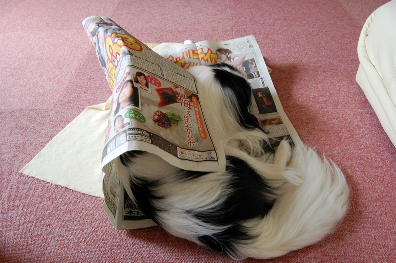 わ~新聞にくるまってるたっくんですね^^